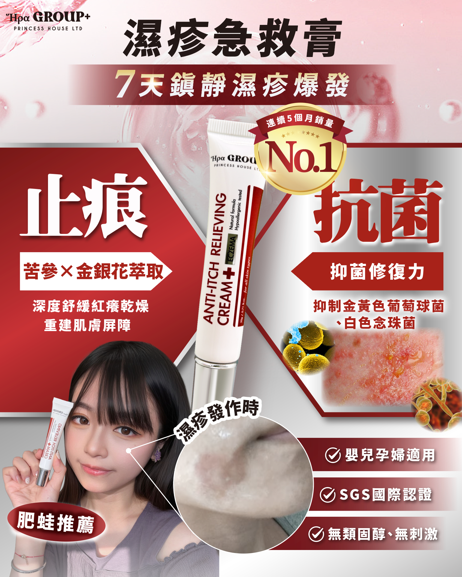 專為舒緩濕疹人士使用,有效緩解乾燥、紅腫和瘙癢,幫助修復皮膚屏障,促進皮膚自然癒合。