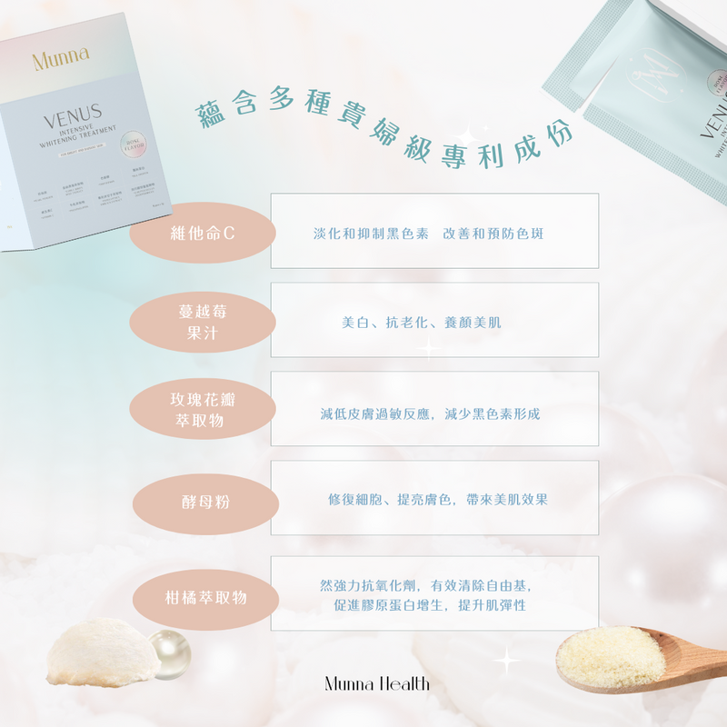 • 維他命C —— 煥白膚色,天然抗氧化劑,有效足進黑色素代謝,防止黑色素沉着、改善和預防色斑。